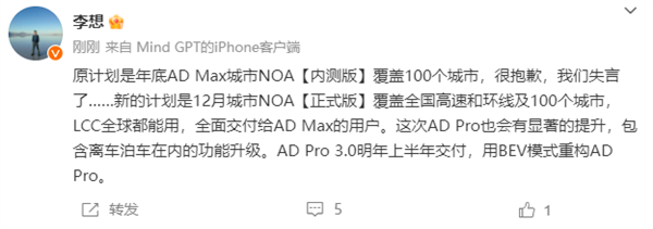 原计划是年底AD Max城市NOA【内测版】覆盖100个城市,很抱歉,我们失言了……