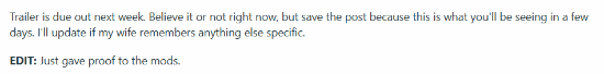 另外,“FollowTheDamnLeakCJ”已经向版主提供了某些证据来支持自己的说法,他表示自己没有看到过预告片,但妻子对其描述了其中的内容。