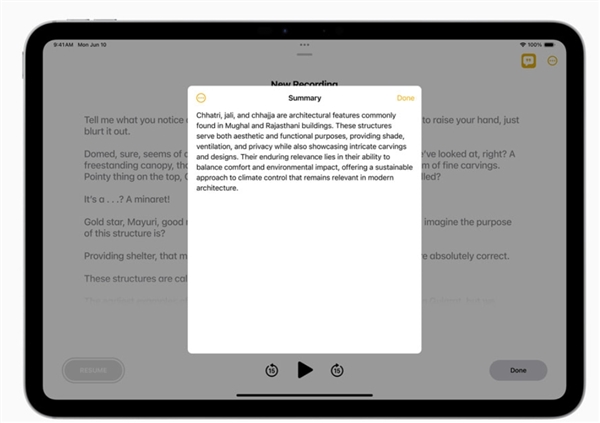 在“备忘录”和“电话”应用中,用户可以录制、转录和总结音频(在通话时启动录音,参与者会自动收到通知)。通话结束后,Apple Intelligence会生成重点摘要。