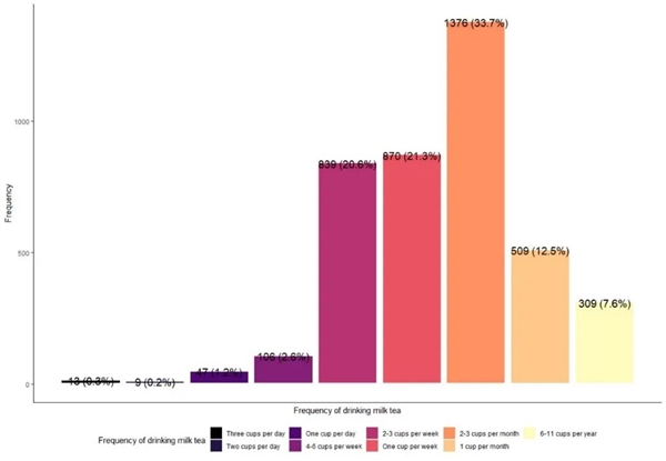 几乎一半的受访者表示,他们每周至少喝一杯奶茶。其中,2.6% 的青少年每周喝 4 至 6 杯奶茶,20.6% 的青少年每周喝 2 至 3 杯奶茶。这一发现为所有人敲响了警钟,因为奶茶不仅在中国,而且在全世界都备受欢迎。