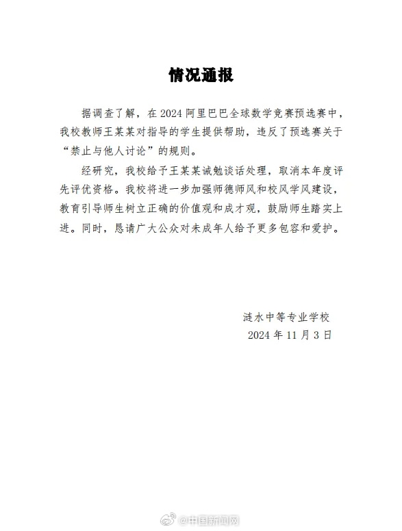 与此同时,江苏省涟水中等专业学校发布情况通报:据调查了解,在2024阿里巴巴全球数学竞赛预选赛中,我校教师王某某对指导的学生提供帮助,违反了预选赛关于“禁止与他人讨论”的规则。经研究,我校给予王某某诫勉谈话处理,取消本年度评先评优资格。