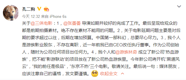 随后,孔二狗在其个人微博回应称,导演张番番已经如期并较好完成了工作,而电影延期则是因为对后期要求超过以往,后期在增加预算,另外,其离职传闻也不属实,只是近一年前由CEO改任执行董事。